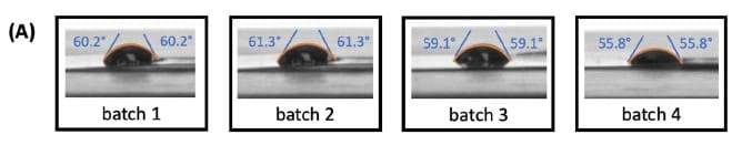 In this study’s batch-variation workflow, the resulting contact-angle data were used to compare hydrophobicity across fabrication batches, across testing solutions (including common buffers), and before/after nanoplatinum metallization.