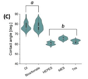 HEPES, MES, and Tris produced significantly lower contact angles on non-modified LIG than DI, and the authors interpret these shifts in the context of surfactant-like behavior and interfacial effects.