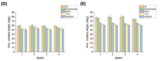Contact angles for non-modified LIG in HEPES, MES, and Tris were reported as significantly lower than DI, and the authors interpret this as each buffer behaving as a mild surfactant impacting surface tension; within-group variation for these buffer conditions was reported as 6% to 8%.