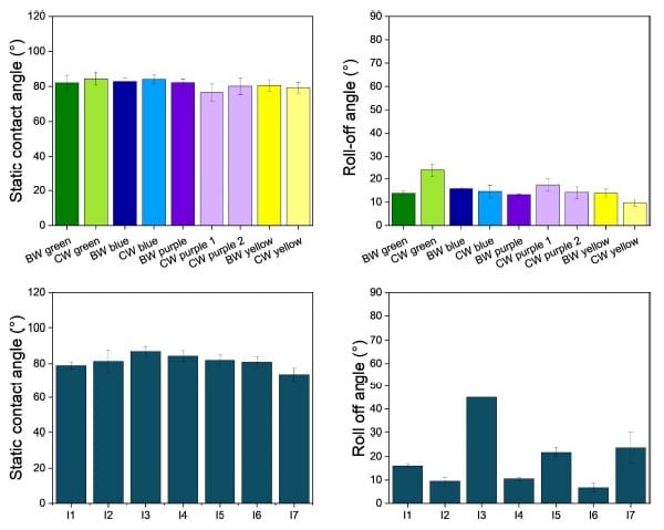 For water measurements at 23 °C, static contact angles were above 90°, and water drops started to roll easily on all measured ski waxes (rolling angle <25°); commercial ski waxes showed slightly lower roll-off angles compared with the corresponding bio-based prototypes (Figure 9).