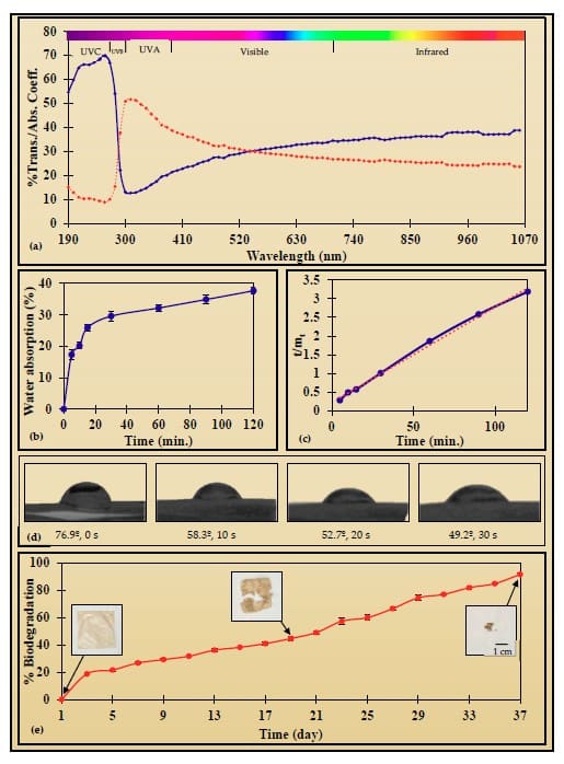 The film formulation was optimized using tensile strength (TS), elongation at break (EB), and water vapor permeability (WVP), and the optimized film was characterized for additional properties including color, spectroscopic properties, hydration-related behavior (e.g., water absorption), and soil biodegradability.