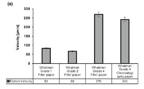 Shows elution velocity of distilled water in different paper grades and supports the choice of Whatman® Grade 4 filter paper for faster wicking.