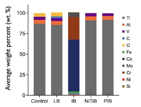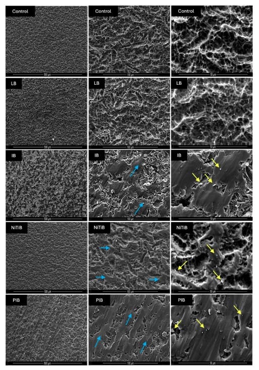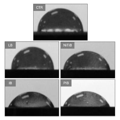 he NiTiB group was reported as significantly more wettable than the control (p < 0.05) but reduced contact angle to a lesser degree than IB and PIB (Table 2 median: 81.0°).