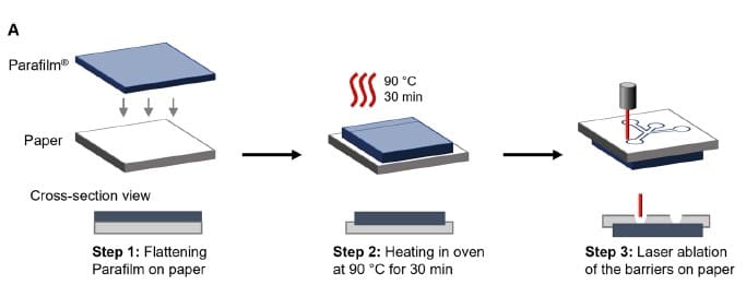 This study presents a Parafilm®-laminated paper microfluidics fabrication workflow and uses water contact-angle measurements to evaluate whether the laser ablation step affects Parafilm® hydrophobicity.