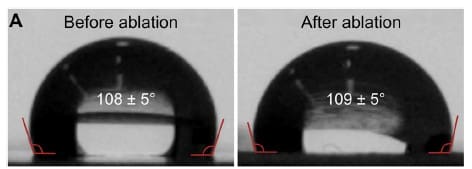 The post-ablation contact angle is measured on the Parafilm® layer exposed by completely ablating a 2.5 × 2.5 cm paper area from the laminated substrate.