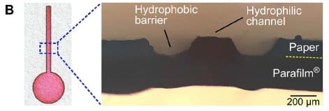 Device characterization included laminated-paper thickness measurements, optical microscopy of the cross-sectional structure, and image/video-based measurements (with ImageJ) of barrier/channel widths and flow speed using dye solutions in HPLC water. Relative humidity and temperature were recorded during flow-speed measurements.