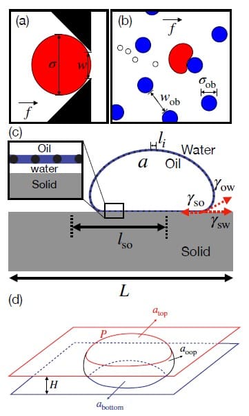 This paper frames surface tension as the capillary property that governs droplet deformability in confined geometries, shaping how droplets slow down, deform, and either pass through or arrest in constrictions and obstacle arrays. The reported oil–water interfacial tension (measured with the ‘‘Dropometer’’) anchors the experimental capillarity scale that is then carried into a quasi-2D, dimensionless description used for experiment–simulation comparison.