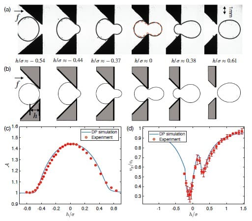 Presents experimental and DP-simulation droplet shapes and speeds through a narrow orifice and reports fitted DP parameters, along with an estimated 𝐺 𝑒 𝑥 𝑝 G exp for the experimental condition.