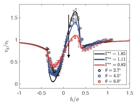 Plots 𝑣 𝑔 / 𝑣 𝑡 v g /v t versus position relative to the orifice for several tilt angles, showing overshoot behavior and reporting fitted line tensions 𝐺 ∗ ∗ G ∗∗ for the calibrated DP simulations.