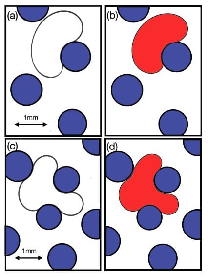 For obstacle arrays, the paper states that permanent clogs can form when