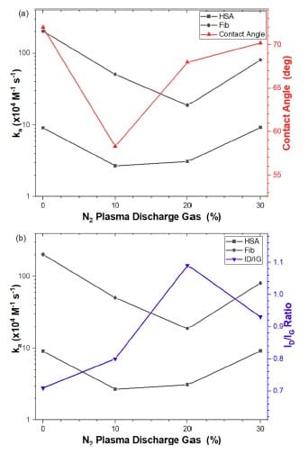 Figure 4 compares ka kinetics for fibrinogen and human serum albumin with the film surface wettability across the %N₂ plasma discharge gas series.