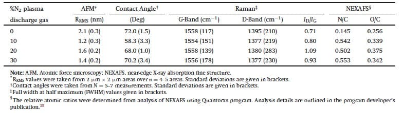 Water contact angles reported in Table 1 are 72.0 (1.5)° (0% N₂), 58.3 (3.3)° (10% N₂), 68.0 (1.0)° (20% N₂), and 70.2 (3.4)° (30% N₂).