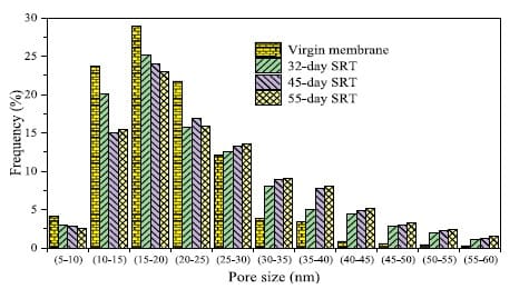 Compared to unused membranes, contact angles of employed membranes decreased by 20% (32-day SRT), 24% (45-day SRT), and 39% (55-day SRT).