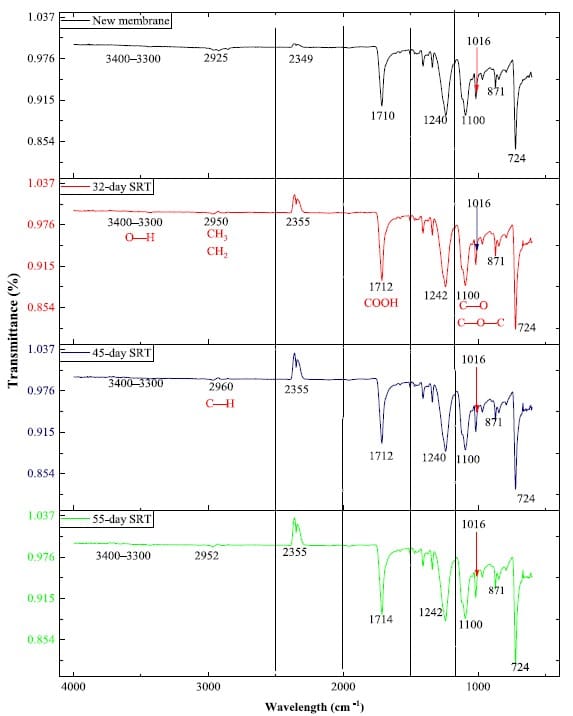 Presents FTIR spectra for pristine and used membranes and discusses band intensity differences across SRT conditions.