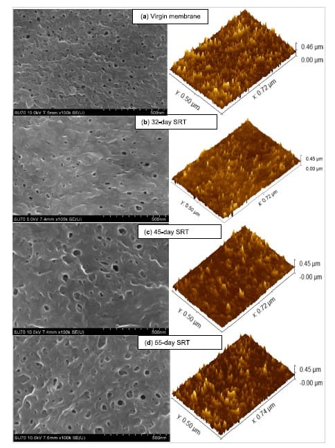 Provides SEM images and surface textures of virgin and used membranes under different SRTs after physical and chemical cleaning.