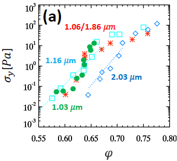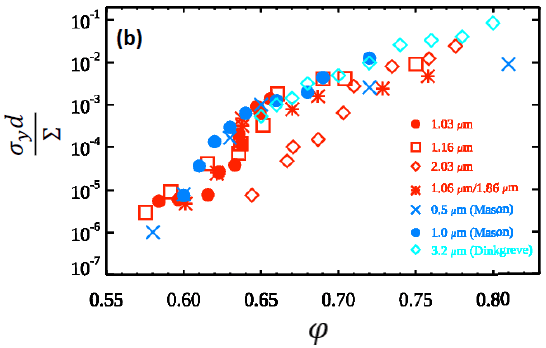 It plots yield stress versus φ with yield stress nondimensionalized by the oil–water surface tension Σ.